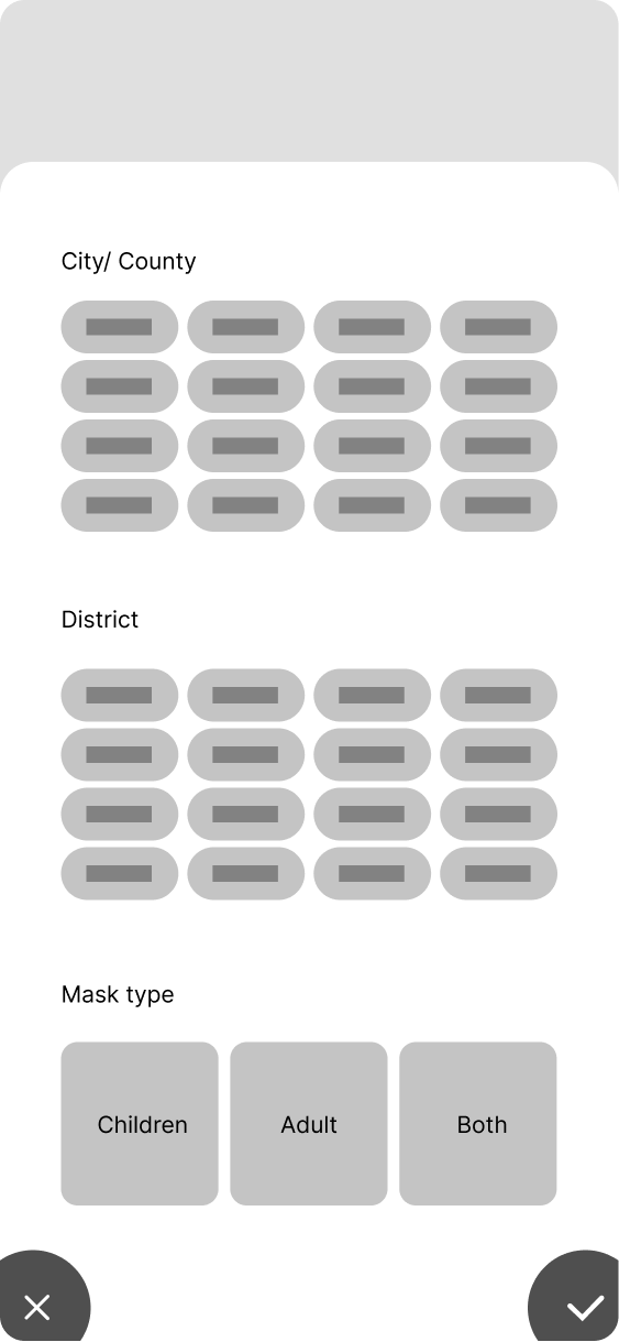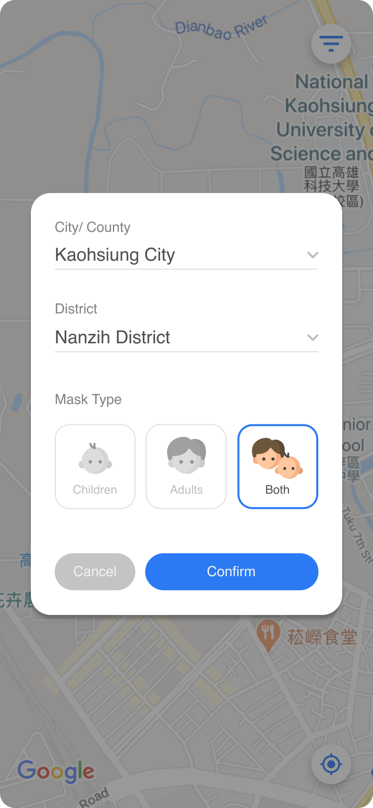 To narrow down the search scope, users can tap on buttons to filter by location and mask type (children and adults).