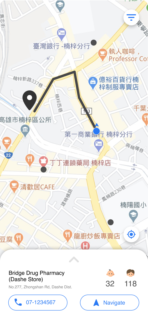 Because of the mask shortage, people want to quickly find and reach a pharmacy with available stock. The map feature provides suggested routes to help users reach their chosen pharmacy faster.