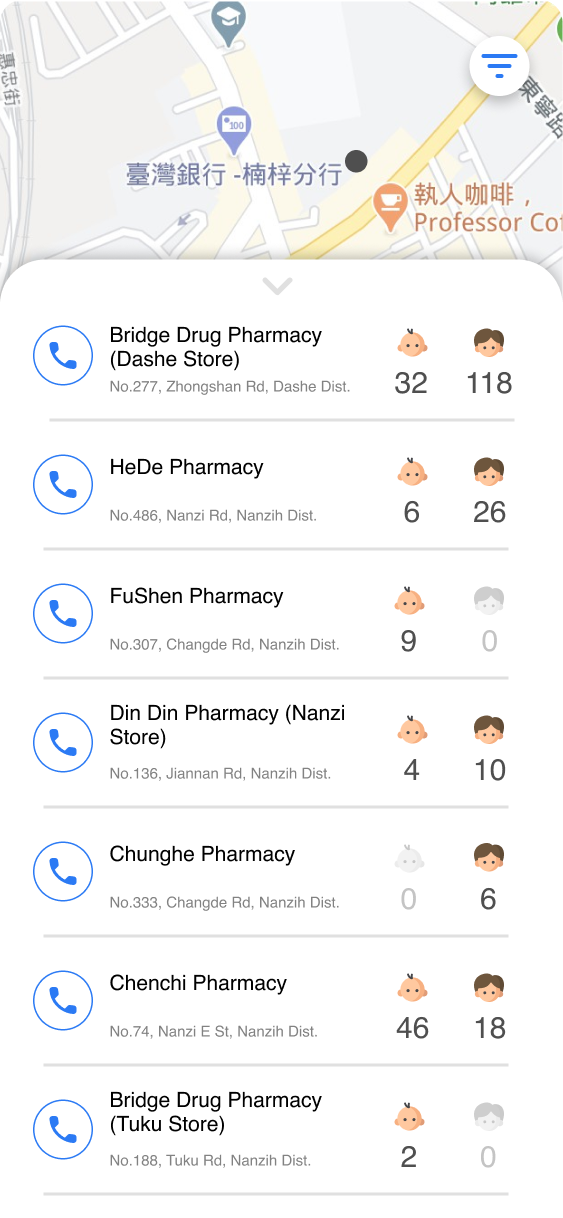 Because of time limitations, we cannot fulfill every ideal design at one time. We eventually published the 1.0 version that only includes the most important features, see the instant number when searching for masks on the map, to help current Taiwanese people get masks first.