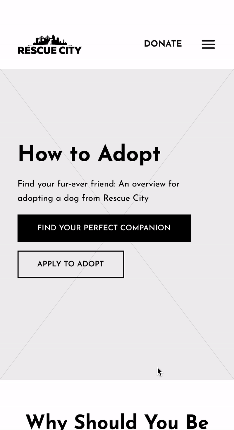 Unfortunately, the existing website was not mobile-friendly for the user group. Our primary goal was to transform the site into a mobile-friendly platform that actively encourages individuals to apply for dog adoption.
